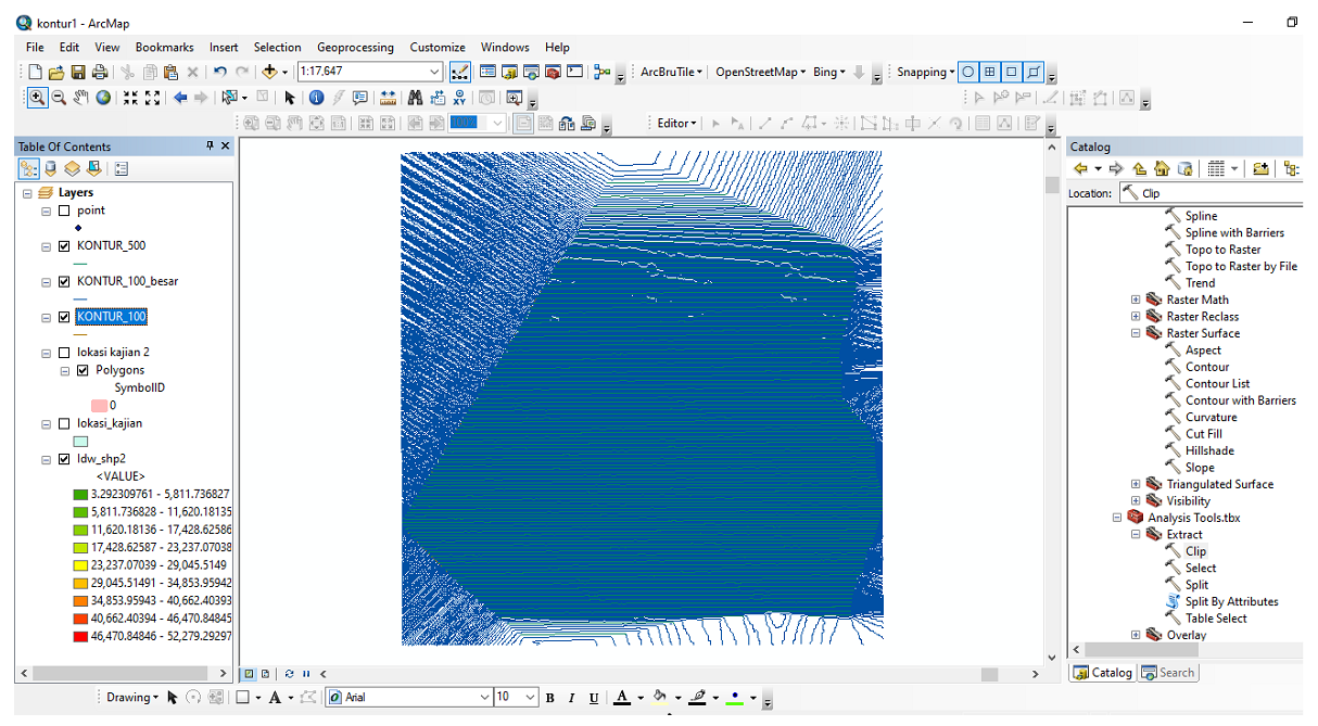- Kemudian masukkan input features garis kontur yang sudah dibuat dan clip features lokasi kajian klik ok dan hasilnya seperti gambar dibawah